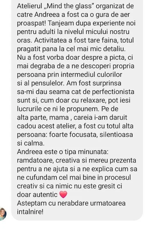 Ateliere creative, cursuri, colaborări și evenimente speciale (Mind the Glass, bachelorette party, corporate party).